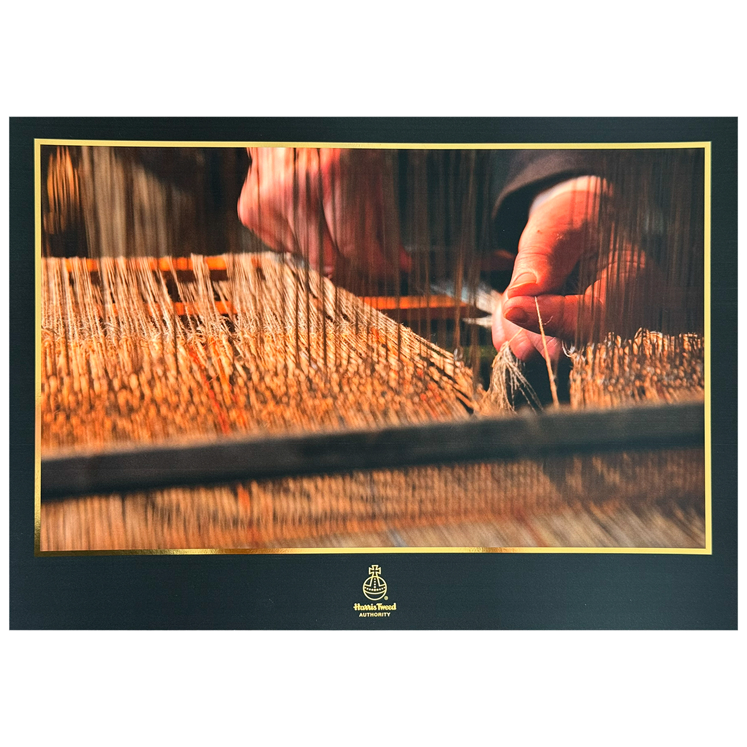 An atmospheric image of a weaver’s hands at the loom. A3 print with a gold foil finish on the Harris Tweed® Orb and surrounding border.